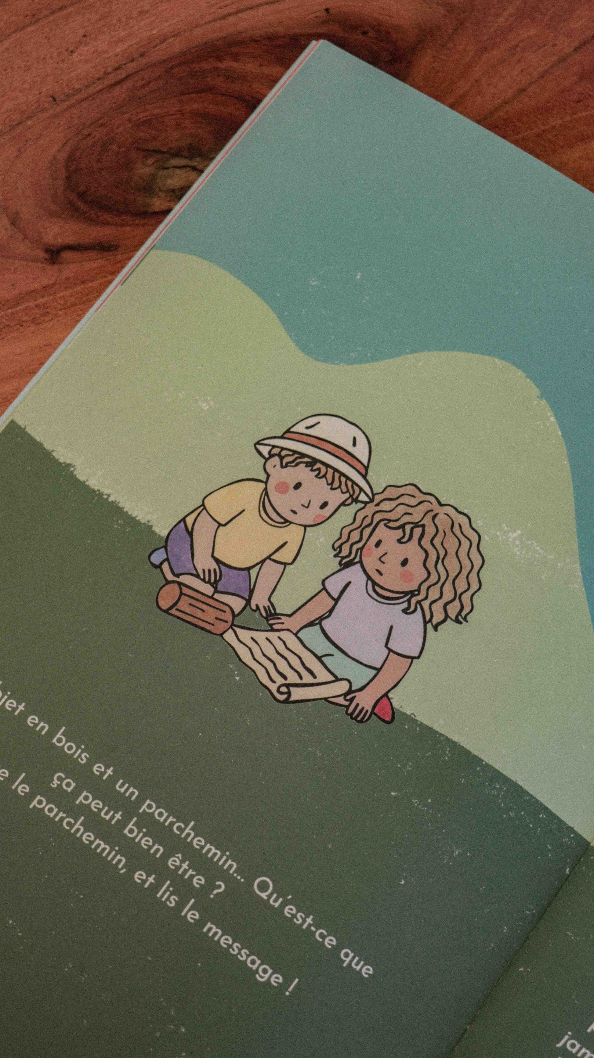 - une petite histoire illustrée autour d’une machine à remonter le temps, qui invite les enfants à voyager dans le passé