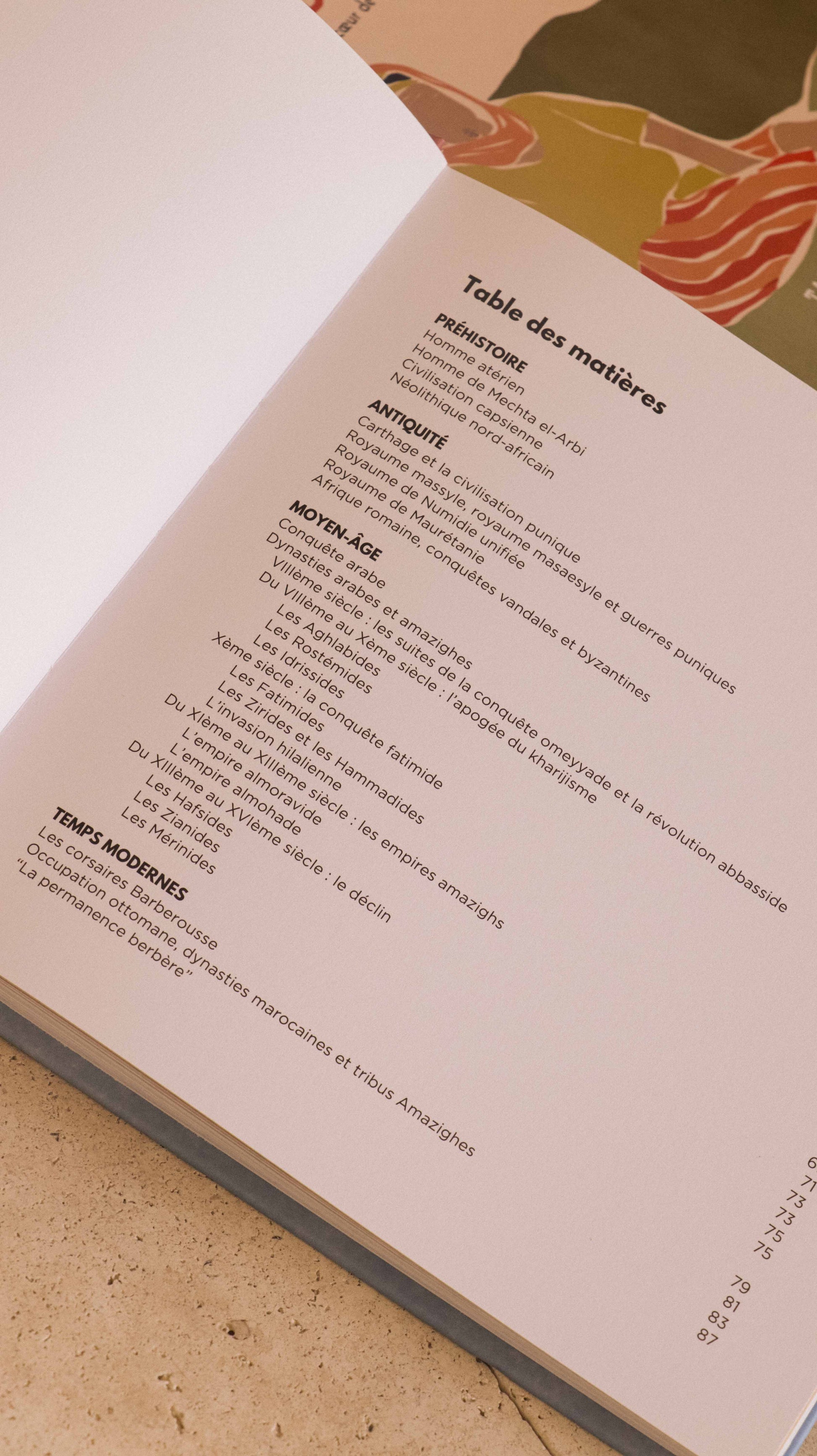 À travers quatre chapitres (Préhistoire, Antiquité, Moyen-Âge, Temps Modernes), notre récit raconte une histoire accessible à tous. Du royaume de Massinissa à la rébellion de Jugurtha, de la fondation de Carthage à sa chute, de la résistance de la Kahina à l'avènement des grandes dynasties arabo-amazighes, des corsaires Barberousse à l’occupation ottomane… Notre récit commence avec l'apparition des premiers hommes en Afrique du Nord et se termine avec la conquête ottomane, à la veille de l'époque contemporaine.